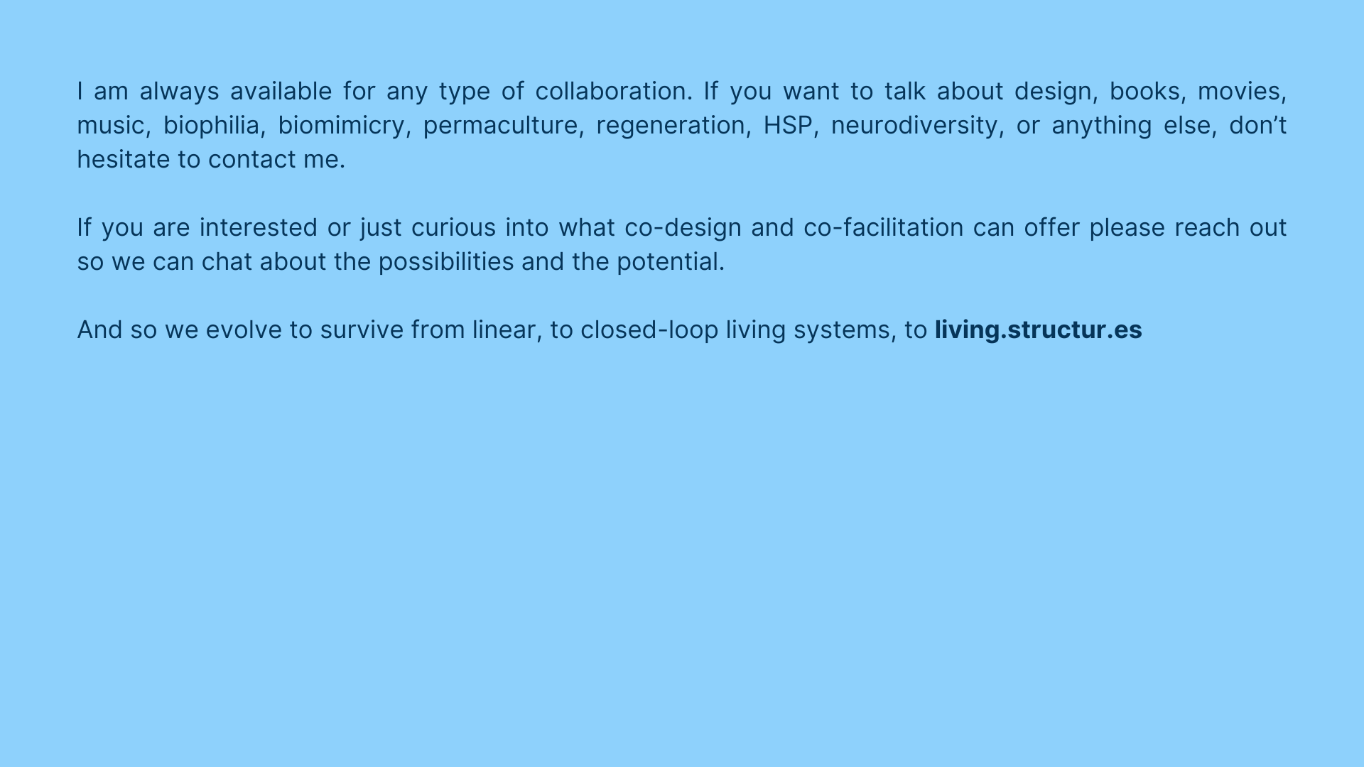 As systems thinker and change maker I am working on shifting the conditions that hold these interconnected problems in the first place.