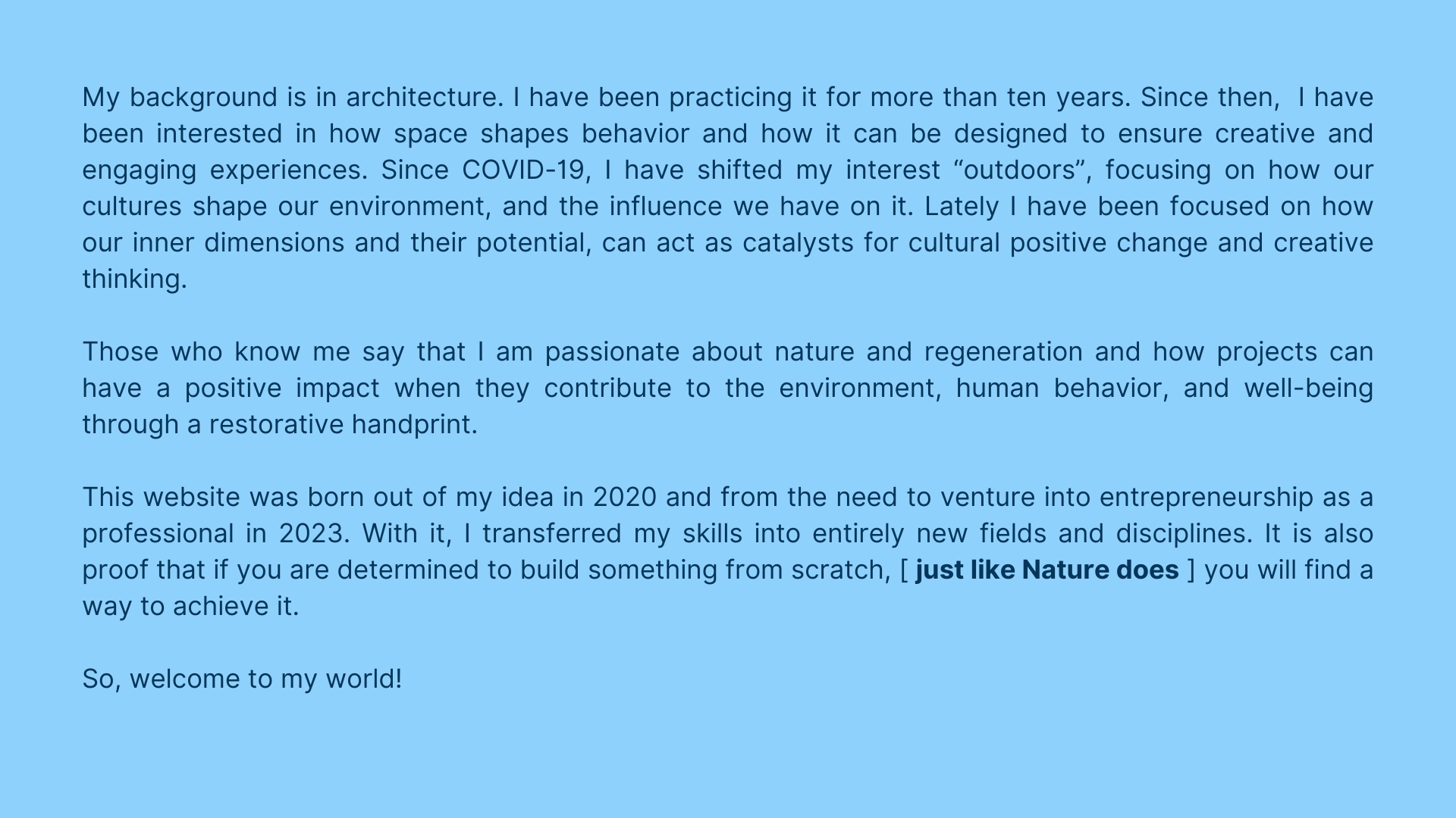 Nature invites us to engage, reflect, and innovate together, ultimately guiding us toward sustainable & regenerative solutions that honor both our needs and the environment’s integrity.