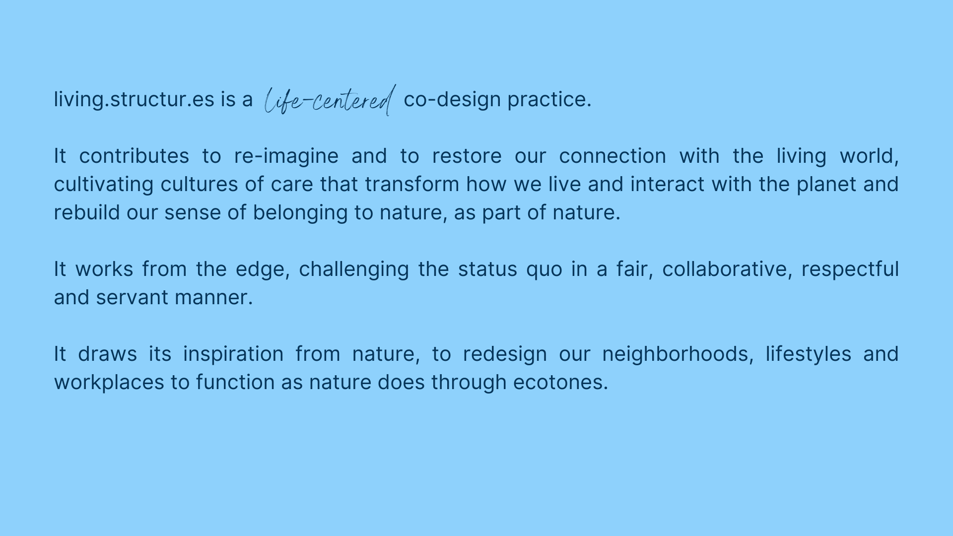 living.structur.es facilitates this shift, decreasing the time it takes for people to recognize their need to ground themselves, to ameliorate their integration to nature, as part of nature.